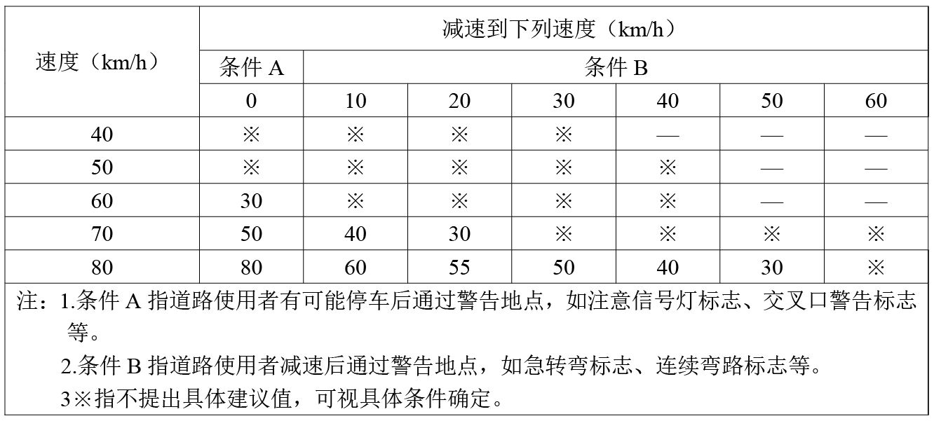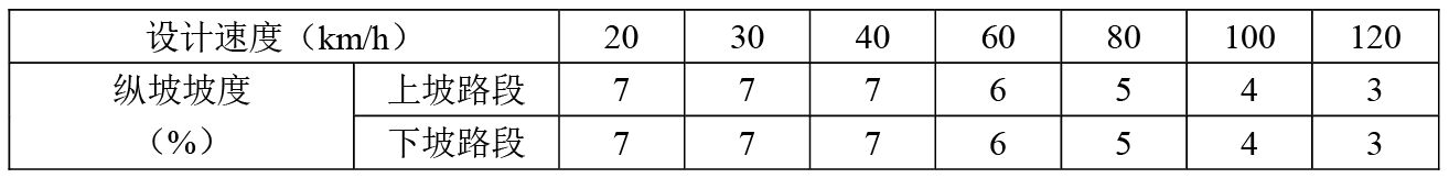 2、當(dāng)縱坡坡度值大于下表規(guī)定值時,應(yīng)當(dāng)設(shè)置“上/下陡坡標(biāo)志”;當(dāng)縱坡坡度值小于下表規(guī)定值時,對于經(jīng)常發(fā)生制動失效事故的下坡路段,也可根據(jù)現(xiàn)場條件設(shè)置“下陡坡標(biāo)志”。