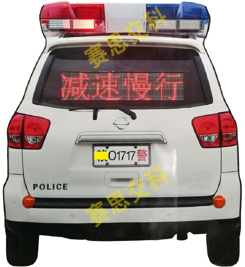2、基本說明:標(biāo)志面層為仿真等比例警車車尾UV噴繪圖案,面層采用鋁質(zhì)板材,標(biāo)志圖案、字樣輪廓嵌入紅色高倍LED發(fā)光管,上置紅、藍(lán)暴閃燈,下方左右各置全紅剎車燈,中間“車窗”設(shè)置發(fā)光警示標(biāo)語,整體結(jié)構(gòu)合理,用材精致。