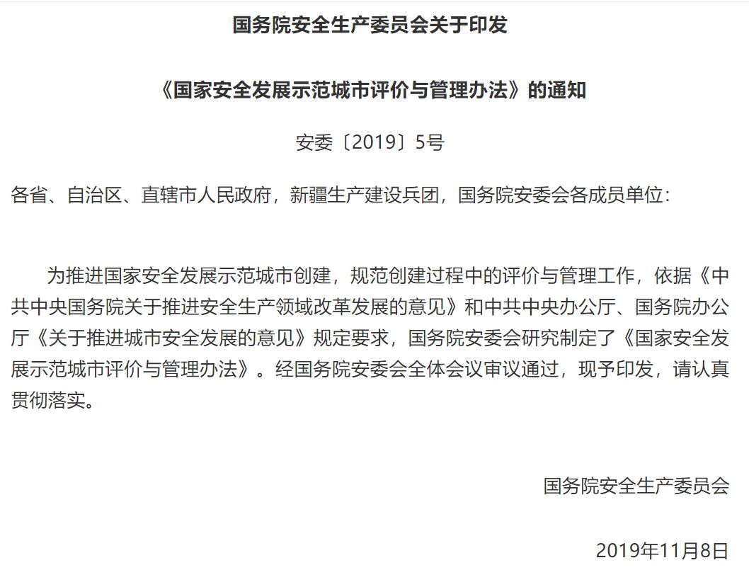 為推進國家安全發展示范城市創建,規范創建過程中的評價與管理工作,11月8日,國務院安全生產委員會,向各省、自治區、直轄市人民政府,新疆生產建設兵團,國務院安委會各成員單位印發了《國家安全發展示范城市評價與管理辦法》(以下簡稱“評價辦法”)的通知。