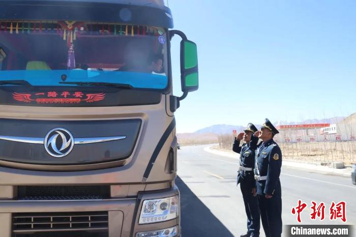 圖為阿里公路部門路政執法人員檢查貨運車輛。西藏自治區路政管理局供圖