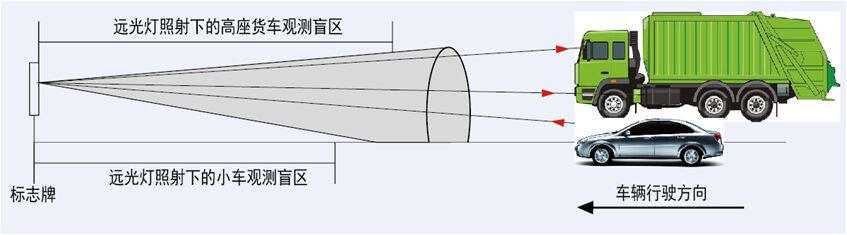 逆反射標志在遠光燈照射下,由于光的衍射性能,在反射時會形成以核心亮、外圍暗為特征的三角光錐。在“回光三角錐”的邊緣或外側,根本無法準確視認標志。這可以解釋,高座貨車即使開啟遠光燈,所看到的標志內容也較普通轎車更為昏暗。