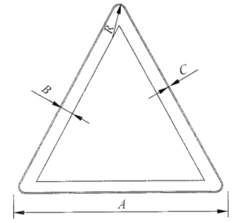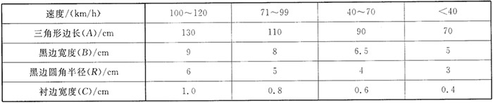國標(biāo)《道路交通標(biāo)志和標(biāo)線》(GB5768.2)中明確規(guī)定:警告類標(biāo)志,形狀為正等邊三角型;反光膜顏色為黃、黑主配色;尺寸大小根據(jù)道路設(shè)計時速而定,通常有邊長70cm、90cm、110cm、130cm等四種。參考依據(jù)如下圖所示。