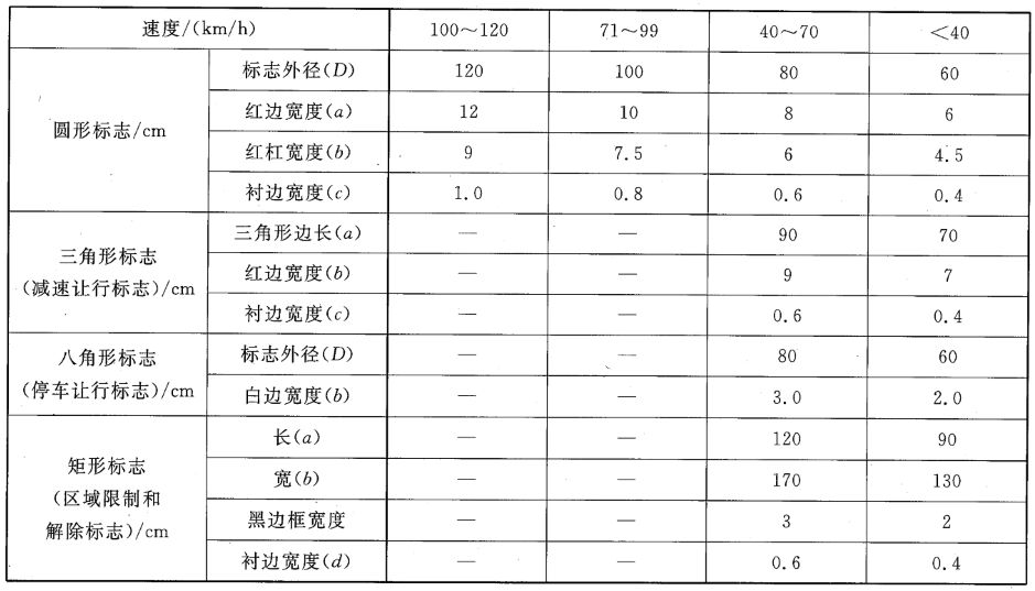 依據國標《道路交通標志和標線》(GB5768.2)中所列圖案,除部分特殊標志,常見的禁令標志為圓型,紅色邊框、黑色斜杠。警告類標志,具體尺寸大小根據道路設計時速而定,通常有直徑60cm、80cm、100cm、120cm等四種。參考依據如下圖所示。