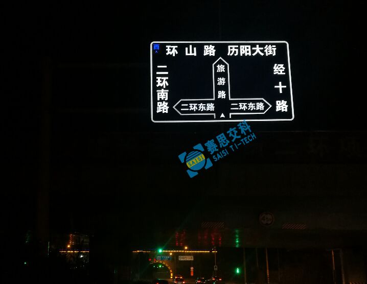 指路標志,作為道路路名、關鍵交通節點的重要指示信息載體,通常設置于道路交叉口進口方向,對前方交叉口的相交路名信息、遠點信息進行提前的預告,便于司機及時獲取關聯道路信息,及時修正駕駛方向,實現準確達到目的地的行車目標。所以指路標志具備遠距離辨認性、全天候視認性、和在交叉口易發現性顯得尤其重要,設計師在選用半透式主動發光標志,正是出于以上的特殊功能性。