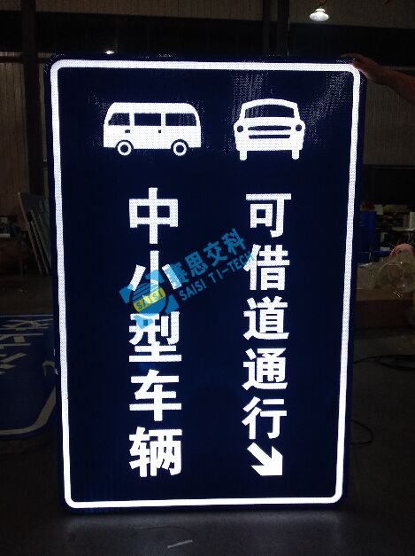 指示標志,通常包括:路名(地點)確認標志、道路功能指示標志(如:車道行駛標志)、道路屬性標志(如:非機動車道標志)、行駛方向指示標志(如:右下行駛標志)等。該類標志通常版面尺寸較小,但所載信息重要關鍵。在城市道路中,到處充斥著各種廣告標志、宣傳標志、店名標志等,指示標志在其中,常常不易被發現,運用半透式主動發光標志,使該類標志主動發光,在夜晚或光照不佳的環境中,能主動發光標志,極易被捕捉發現,這是交通安全設計師非常看重的特殊化功能優勢。