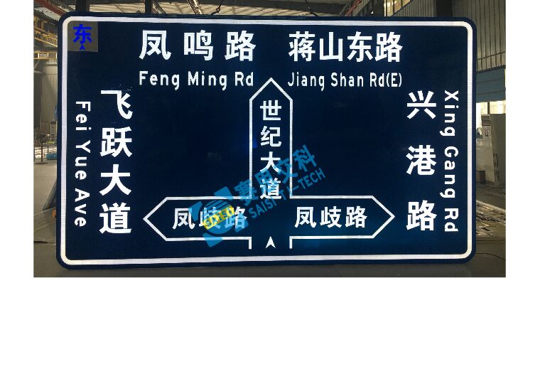 4、指路標志 。在道路中,根據不同道路級別,設置于交叉口進口方向,通常據進口車道停止線80—120米范圍內。