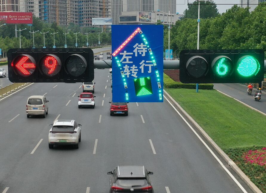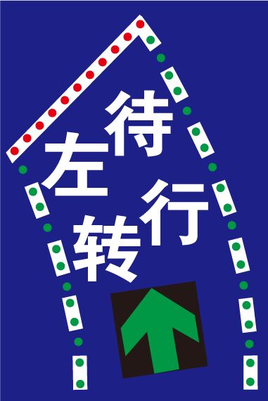 ?2、工藝說明:標志版面由LED發光管組成停車線、邊緣線、“左轉待行”文字;由顯示屏動態(P10)顯示紅、黃、綠三色動態箭頭,通過控制模塊調取信號燈燈色狀態,在標志版面形成動態三種狀態,動態引導待轉車流通行權限。