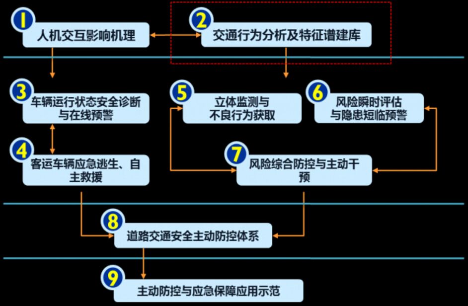 道路交通安全主動防控技術與系統集成”為國家重點研發計劃項目,整個項目共包括九個課題:(1)不同道路類型與交通環境條件下人-車交互影響機理;(2)道路交通行為分析及特征譜建庫技術;(3)車輛級和網絡級在途車輛運行狀態安全診斷與在線預警平臺(4)重大事故下客運車輛應急逃生、自主救援關鍵技術及裝備;(5)道路交通行為立體監測與不良行為高準確獲取技術及裝備;(6)特殊條件下道路交通安全風險瞬時評估與隱患短臨預警平臺;(7)道路安全(行駛車輛)風險綜合防控與主動干預技術及裝備;(8)基于聯網聯控監測信息的道路交通安全主動防控體系與系統集成;(9)道路網交通安全主動防控與應急保障技術示范及應用。該項目通過在云南、北京、上海、重慶、河北、陜西、廣東開展示范應用,形成了覆蓋多種道路類型、不良駕駛行為的工程實施效果評價方法。