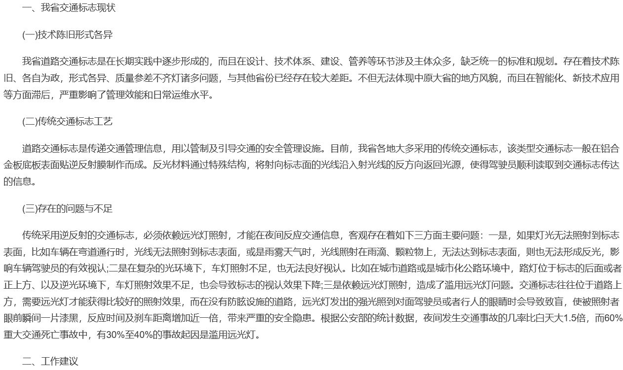 傳統(tǒng)的逆反射交通標(biāo)志,在特殊的交通環(huán)境種,存在功能的局限性。《人民交通網(wǎng)》于2022年1月12日發(fā)文《關(guān)于編制統(tǒng)一的交通標(biāo)志設(shè)置規(guī)范 推廣應(yīng)用主動發(fā)光交通標(biāo)志》中提到:“傳統(tǒng)采用逆反射的交通標(biāo)志,必須依賴遠(yuǎn)光燈照射,才能在夜間反應(yīng)交通信息,客觀存在著如下三方面主要問題:一是,如果燈光無法照射到標(biāo)志表面,比如車輛在彎道通行時,光線無法照射到標(biāo)志表面,或是雨霧天氣時,光線照射在雨滴、顆粒物上,無法達(dá)到標(biāo)志表面,則也無法形成反光,影響車輛駕駛員的有效視認(rèn);二是在復(fù)雜的光環(huán)境下,車燈照射不足,也無法良好視認(rèn)。比如在城市道路或是城市化公路環(huán)境中,路燈位于標(biāo)志的后面或者正上方、以及逆光環(huán)境下,車燈照射效果不足,也會導(dǎo)致標(biāo)志的視認(rèn)效果下降;三是依賴遠(yuǎn)光燈照射,造成了濫用遠(yuǎn)光燈問題。交通標(biāo)志往往位于道路上方,需要遠(yuǎn)光燈才能獲得比較好的照射效果,而在沒有防眩設(shè)施的道路,遠(yuǎn)光燈發(fā)出的強(qiáng)光照到對面駕駛員或者行人的眼睛時會導(dǎo)致致盲,使被照射者眼前瞬間一片漆黑,反應(yīng)時間及剎車距離增加近一倍,帶來嚴(yán)重的安全隱患。根據(jù)公安部的統(tǒng)計(jì)數(shù)據(jù),夜間發(fā)生交通事故的幾率比白天大1.5倍,而60%重大交通死亡事故中,有30%至40%的事故起因是濫用遠(yuǎn)光燈。”。