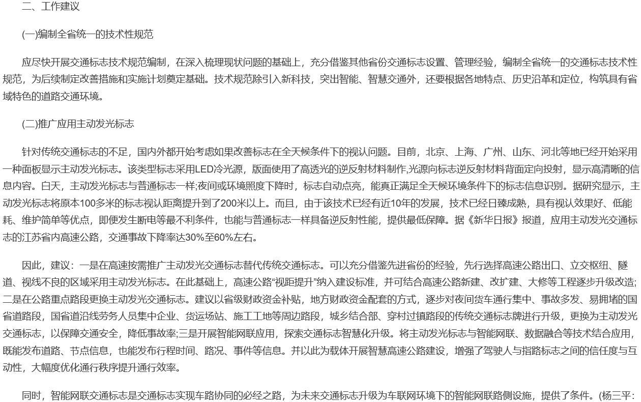 主動發(fā)光標(biāo)志,因其具備獨(dú)特的功能優(yōu)勢,主要有:(1)能主動發(fā)光,不需依賴汽車遠(yuǎn)光燈照射;(2)提升標(biāo)志的遠(yuǎn)距離視認(rèn)性;(3)增強(qiáng)標(biāo)志的易捕捉性和警示性;(4)增強(qiáng)標(biāo)志在雨、霧、冰、雪、霾、逆光等惡劣交通環(huán)境中,仍能保持良好的顯示效果。上述功能能彌補(bǔ)在特殊交通環(huán)境中普通逆反射標(biāo)志的功能不足現(xiàn)象。為此,文中還給出相關(guān)建議:“一是在高速按需推廣主動發(fā)光交通標(biāo)志替代傳統(tǒng)交通標(biāo)志。可以充分借鑒先進(jìn)省份的經(jīng)驗(yàn),先行選擇高速公路出口、立交樞紐、隧道、視線不良的區(qū)域采用主動發(fā)光標(biāo)志。在此基礎(chǔ)上,高速公路“視距提升”納入建設(shè)標(biāo)準(zhǔn),并可結(jié)合高速公路新建、改擴(kuò)建、大修等工程逐步升級改造;二是在公路重點(diǎn)路段更換主動發(fā)光交通標(biāo)志。建議以省級財(cái)政資金補(bǔ)貼,地方財(cái)政資金配套的方式,逐步對夜間貨車通行集中、事故多發(fā)、易擁堵的國省道路段,國省道沿線勞務(wù)人員集中企業(yè)、貨運(yùn)場站、施工工地等周邊路段,城鄉(xiāng)結(jié)合部、穿村過鎮(zhèn)路段的傳統(tǒng)交通標(biāo)志牌進(jìn)行升級,更換為主動發(fā)光交通標(biāo)志,以保障交通安全,降低事故率;三是開展智能網(wǎng)聯(lián)應(yīng)用,探索交通標(biāo)志智慧化升級。將主動發(fā)光標(biāo)志與智能網(wǎng)聯(lián)、數(shù)據(jù)融合等技術(shù)結(jié)合應(yīng)用,既能發(fā)布道路、節(jié)點(diǎn)信息,也能發(fā)布行程時間、路況、事件等信息。并以此為載體開展智慧高速公路建設(shè),增強(qiáng)了駕駛?cè)伺c指路標(biāo)志之間的信任度與互動性,大幅度優(yōu)化通行秩序提升通行效率。”