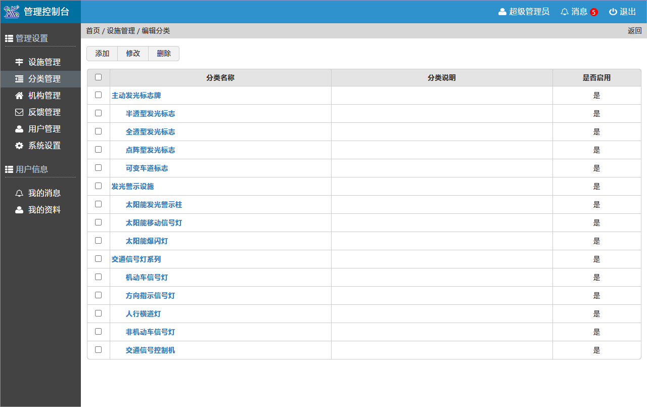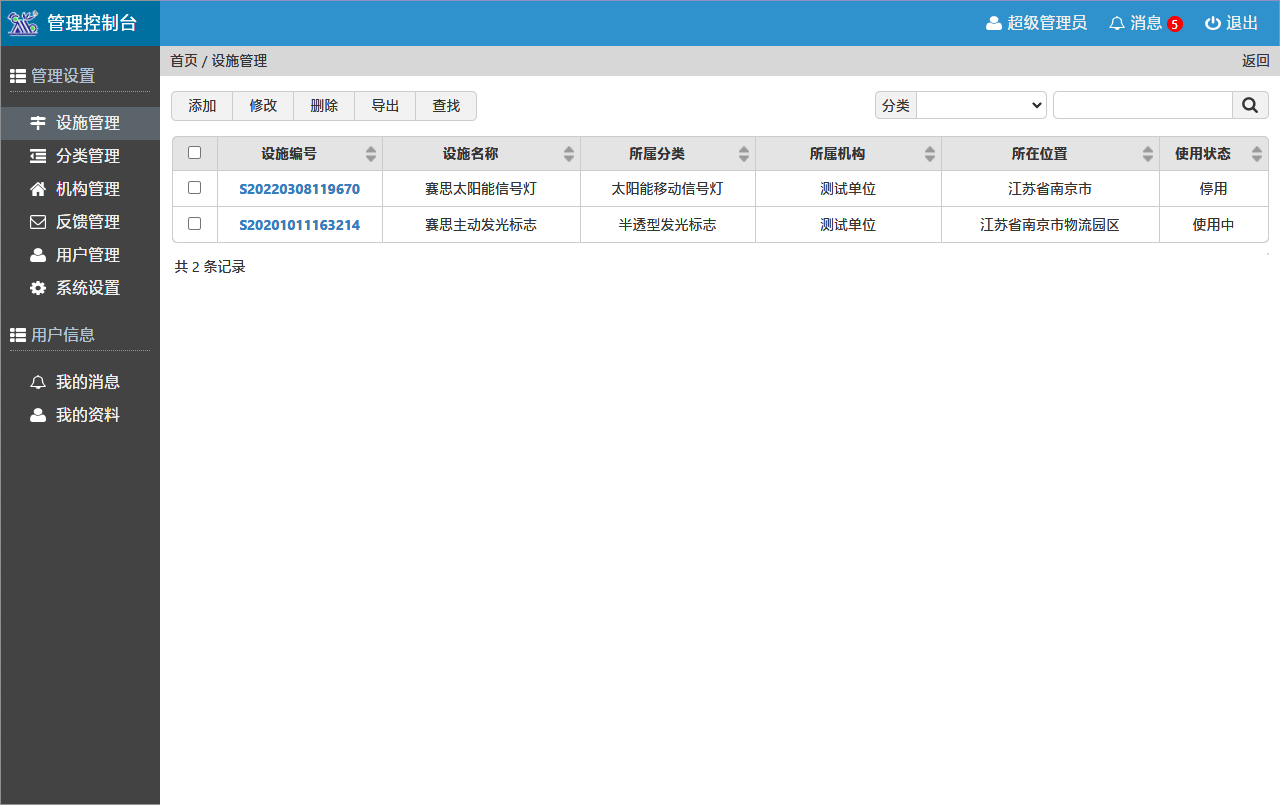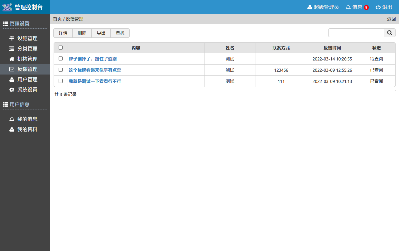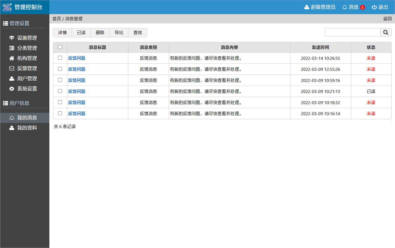 設(shè)施管理系統(tǒng)擁有完善的后臺(tái)管理功能,可按列表添加設(shè)施設(shè)備,可按層級(jí)添加分類、機(jī)構(gòu)。可以添加多個(gè)管理用戶,并設(shè)置不同管理權(quán)限。當(dāng)收到反饋信息后,能及時(shí)顯示新消息數(shù)量。在反饋管理模塊中,可查看當(dāng)前反饋的信息列表,及時(shí)處理對(duì)應(yīng)問題。