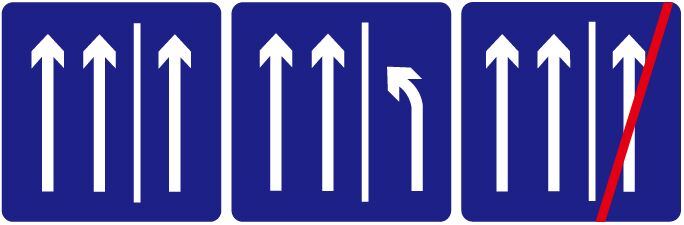 說明:表示該處硬路肩允許車輛通行,上左圖設置于起點;上中圖設置于即將結束處,提示盡快合流;上右圖設置于終點處。