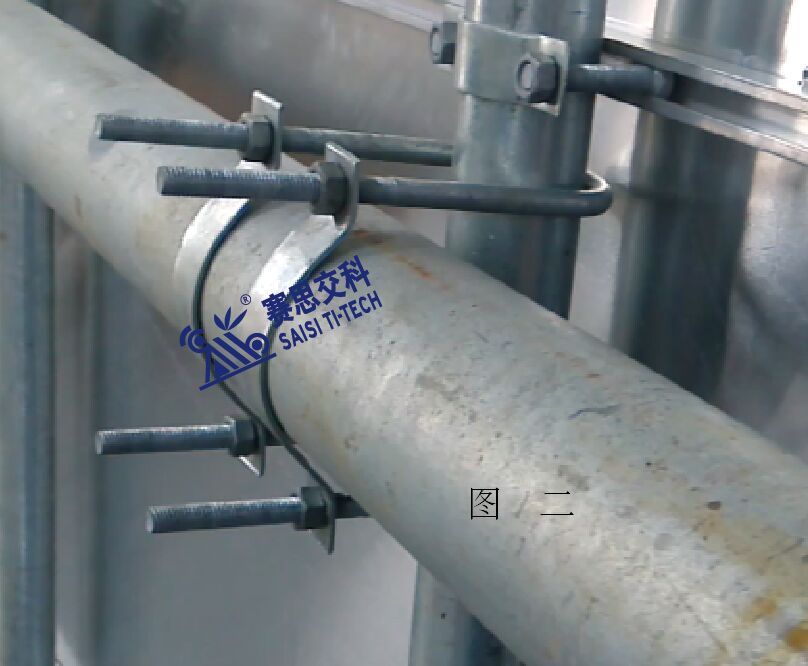 (2)將小圓管固定在懸臂上。用兩只U型卡,如圖下圖所示,安裝于懸臂桿的上下,一端套在小圓管上,一端上下貼在懸臂上,用懸臂對應尺寸的半片抱箍,在外側固定。(注:擰螺絲時,先不要一步擰緊到位,略緊即可,待全部抱箍、U型卡安裝到位后,檢查無誤時,再最終擰緊加固;有誤時,方便調整、修正。)