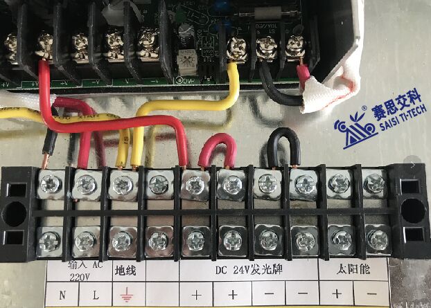 (4)控制線接電。本操作必須為持證的專業電工!!標志牌背面出1根2芯電纜線,內部工作電壓為DC24V,注意區分電線的正負極(具體供貨隨附的《安裝說明書》會詳細列明),將這兩根線接入"DC發光標志牌"所示接線端子上,嚴謹接入旁邊的高壓區!!接線板如下圖所示。將“空開”按鍵下拉至“關閉”狀態 ,再將市電接線接入左側,輸入AC220V的接線端子,在開啟電源前,先檢查以下接線,確保準確無誤后,方可開啟電源。注:控制系統為自動光控(白天不亮,夜晚自動開啟),白天安裝時,需測試,可用黑色物蓋在控制箱的光敏端子上,模擬夜晚效果。