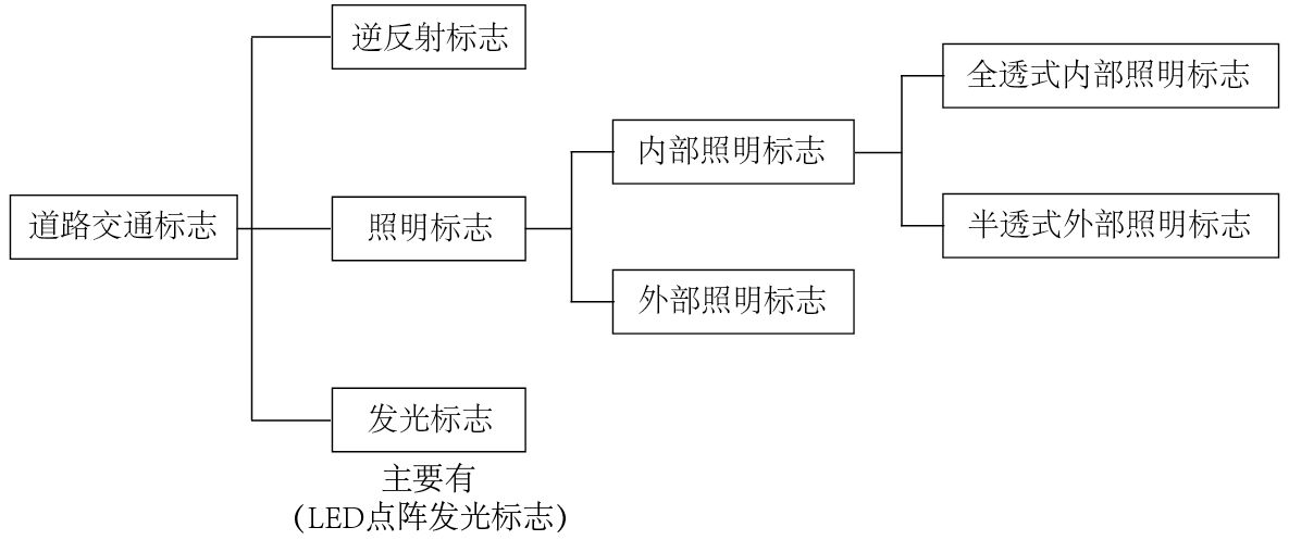 要了解主動(dòng)發(fā)光標(biāo)志,首先須了解它的大致分類和名稱。依據(jù)國(guó)標(biāo)《道路交通標(biāo)志和標(biāo)線 之 第2部分 道路交通標(biāo)志》(GB 5768.2~2022版)之4.2.4條分類定義,“道路交通標(biāo)志按光學(xué)特性分類,分為逆反射標(biāo)志、照明標(biāo)志和發(fā)光標(biāo)志,其中照明標(biāo)志按光源安裝位置又分為內(nèi)部照明標(biāo)志和外部照明標(biāo)志”。其中“逆反射標(biāo)志”,就是常說的“非光源類”反光膜標(biāo)志牌,僅依賴于反光膜的逆反射功能來實(shí)現(xiàn)標(biāo)志牌受光后的反光效果;如果把“內(nèi)部照明標(biāo)志”按照發(fā)光面積與整版面積的占比度,再繼續(xù)拆分出子概念,就目前市場(chǎng)可見,內(nèi)部照明標(biāo)志又分為“全透式內(nèi)部照明標(biāo)志”和“半透式內(nèi)部照明標(biāo)志”。其中“發(fā)光標(biāo)志”,國(guó)標(biāo)沒有明確給出定義和概念的內(nèi)涵,但從其分類上來思考,大致可以知道其劃分的依據(jù):逆反射標(biāo)志——自身沒有發(fā)光光源;照明標(biāo)志——標(biāo)志面板外,或標(biāo)志內(nèi)部有光源;剩下的“發(fā)光標(biāo)志”該如何定義?從概念的外延上,采用逐一排除法,剩下的就是“標(biāo)志面板上有光源”這一類,其產(chǎn)品主要有、但不僅限于“LED點(diǎn)陣發(fā)光標(biāo)志”,其分類層次圖大致如下。