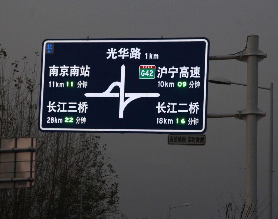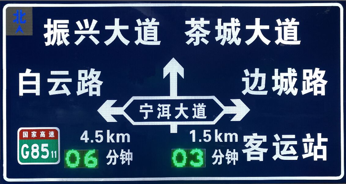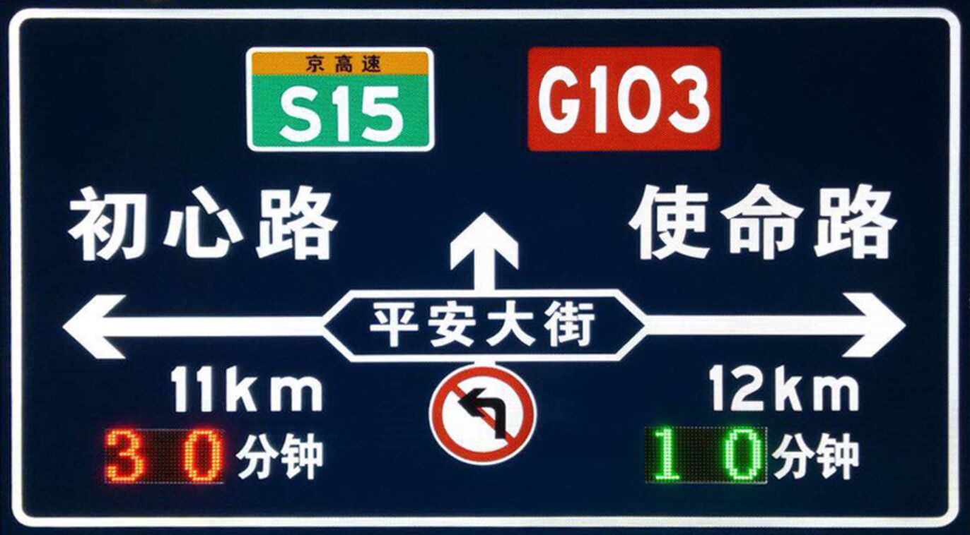 將標志安裝點位與重要節點的距離長度、到達預估時間有效統一在標志版面中,給機動交通參與者提供時間、空間的實時數據參考,及時改善行車預期軌跡,為交通管理部門緩解交通擁堵,合理分配區域交通流,提供有效的宏觀規劃。