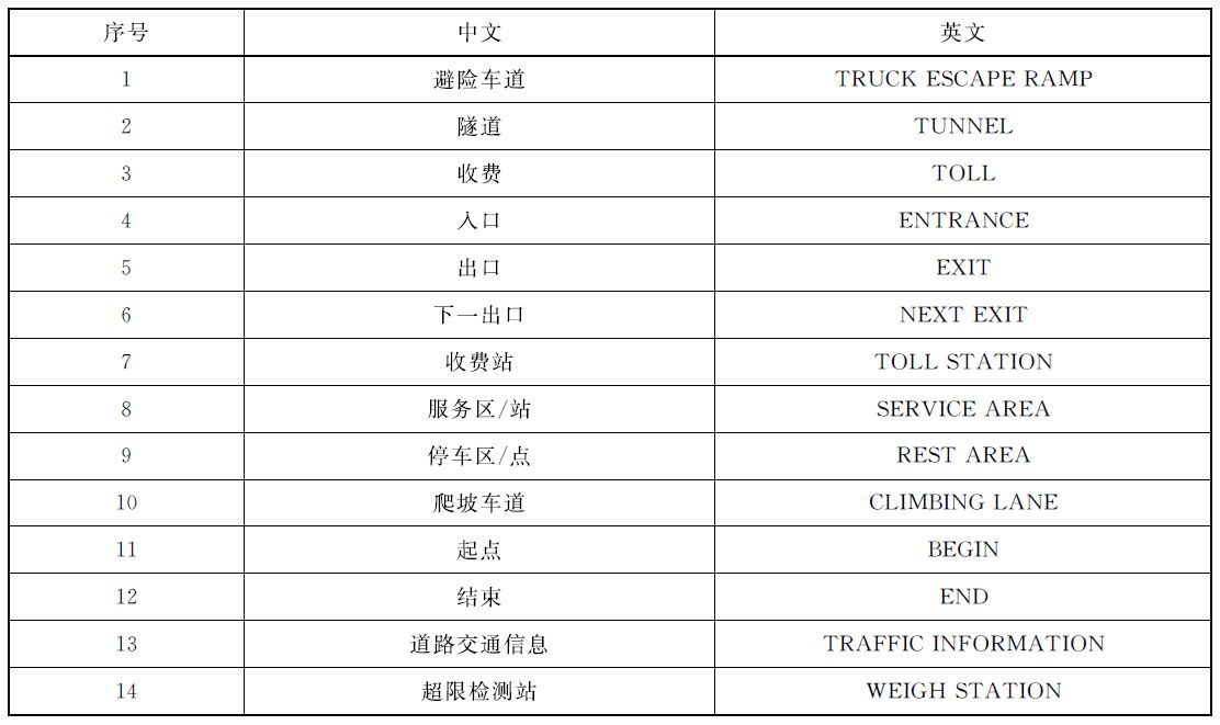 3、如采用英文專用名詞,宜全部大寫。如:安全出口,為“EXIT”;又如收費(fèi),為“TOLL”,《交通標(biāo)志專用名詞中英文對(duì)照表》詳見(jiàn)下表所示: