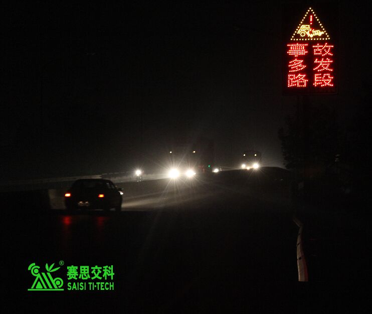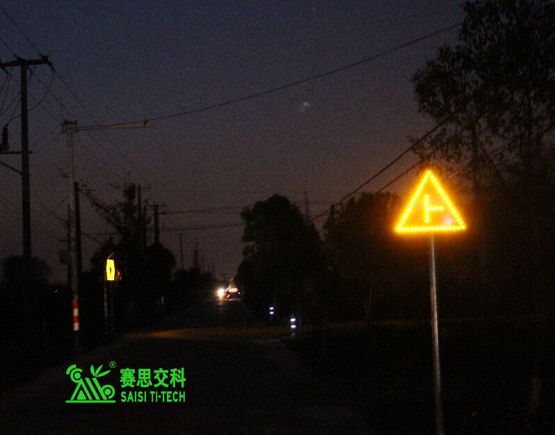 ②交通標(biāo)志。公路主線應(yīng)設(shè)置必要的“限速+注意前方岔口”標(biāo)志,有條件的,可采用太陽能主動發(fā)光標(biāo)志,以提升遠(yuǎn)距離視認(rèn)性,及夜間警示效果。