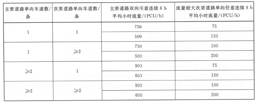 II、條件二:路口任意8小時的機(jī)動車平均小時流量超過下表數(shù)值時。