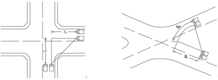 II、停車線垂直面對來車方向。畸形接入口,可通過交通標(biāo)線渠化設(shè)計,將停車線垂直方向面向來車方向,增強(qiáng)支路流量進(jìn)入叉口的觀察視角。