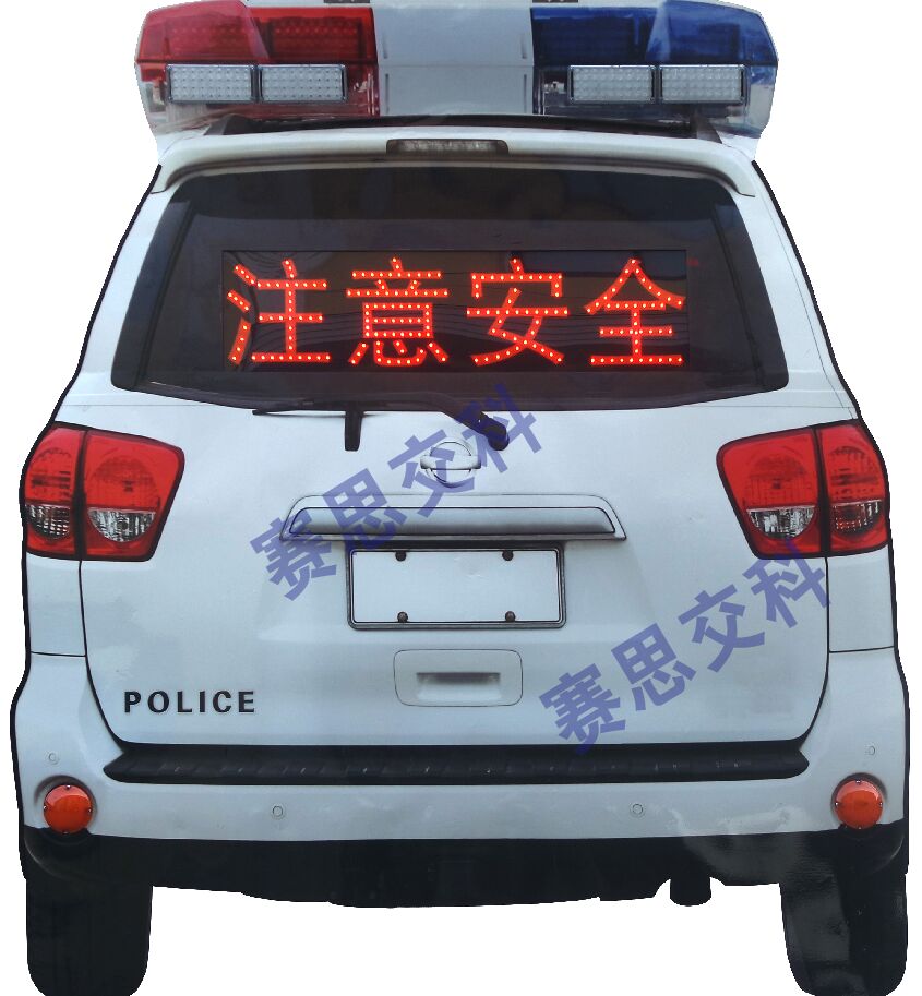 2、基本說明:標志面層為仿真等比例警車車尾UV噴繪圖案,面層采用鋁質板材,標志圖案、字樣輪廓嵌入紅色高倍LED發光管,上置紅、藍暴閃燈,下方左右各置全紅剎車燈,中間“車窗”設置發光警示標語,整體結構合理,用材精致。