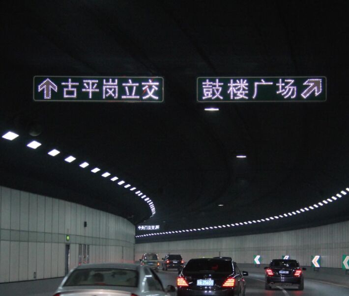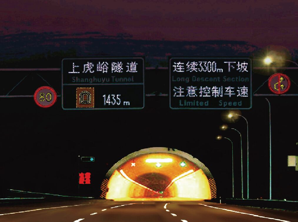 1、在隧道入口前,根據隧道長度和線形、交通狀況、前后路段線形等情況,選擇設置以下標志:隧道指示標志、限高標志、限速標志、禁止超車標志等 。