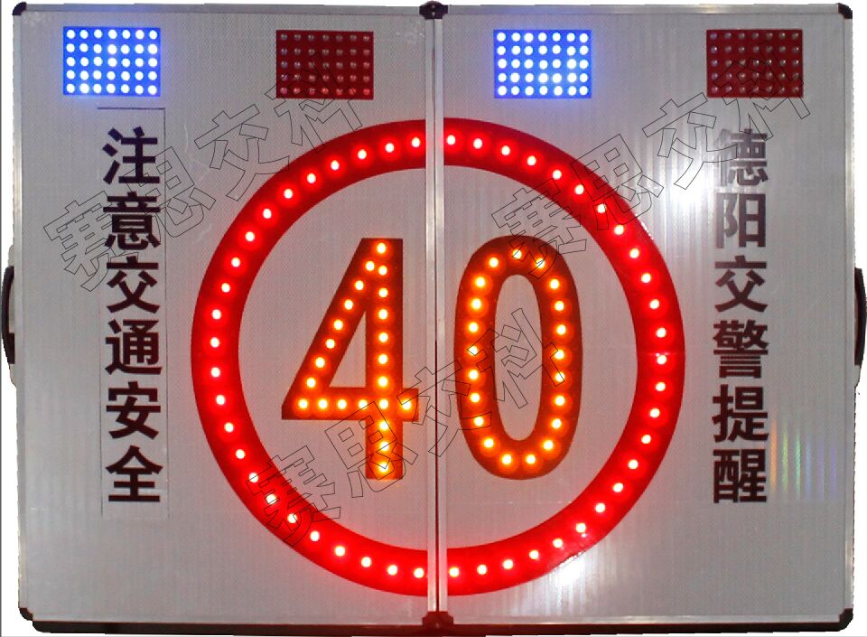 2、標(biāo)志版面設(shè)置LED發(fā)光限速標(biāo)志圖案,上置2組(紅爆閃燈+藍(lán)爆閃燈),兩邊設(shè)置交通警示標(biāo)語(yǔ)或管制單位。標(biāo)志整體展開(kāi)后,配置支撐架,放置于管理路段,標(biāo)志閉合時(shí),配有手提把,警員可輕松提攜,方便、便攜。