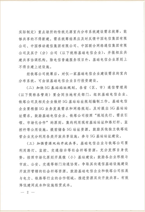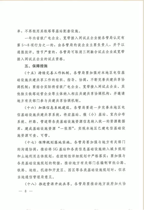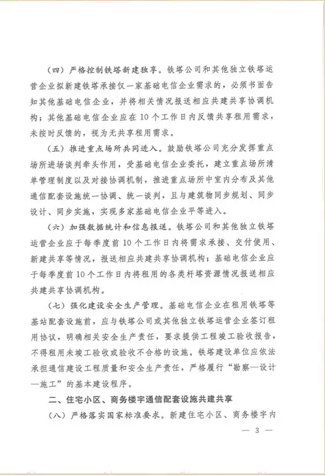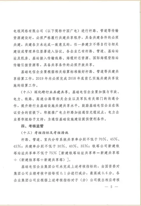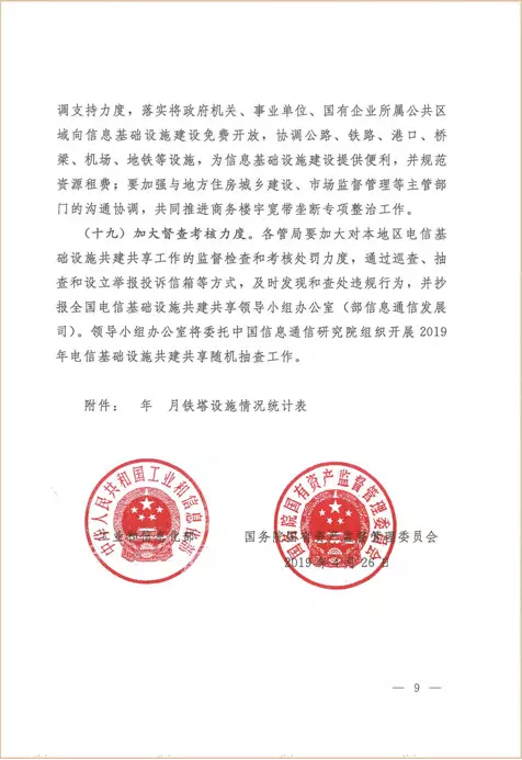 近日,《工業和信息化部》與《國務院國有資產監督管理委員會》聯合發文《關于2019年推進電信基礎設施共建共享的實施意見》(工信部聯通函(2019)123號),文件針對:全省、自治州、直轄市通信管理局、中國電信集團有限公司、中國移動通信集團有限公司、中國聯合網絡通信集團有限公司、國家電網有限公司、中國南方電網有限責任公司、中國廣播網絡有限公司、中國鐵塔股份有限公司等涉及通訊業務的公司,文件提出:2019年,電信基礎設施共建共享工作將以持續提升資源共建共享水平、有力支撐行業高質量發展為目標,強化統籌集約建設和存量資源共享,積極拓展跨行業共建共享范圍,保障通信基礎設施建設通行權和公平進入,促進行業減低增效。